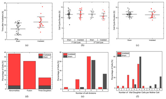 Figure 5b shows the duration of the first and second full cell cycles for the sham and irradiated samples. The duration of a cell cycle was defined as the time between two complete cell divisions of a cell and was calculated for every mother cell, the cells that were initially in the video and based on which the cell lineages were created. Consequently, the duration of the first cell cycle was the time between the first and second cell divisions. To determine the first cell cycle duration for a mother cell, the mean of the first cell cycle durations of the corresponding two daughter cells is calculated. Analogously, the duration of the second cell cycle per mother cell was the mean duration between the second and third cell divisions of the four daughter cells. The first cell cycles of the sham sample lasted an average of 11.8 ± 0.3 h and were as long as the second cell cycle, which lasted an average of 11.4 ± 0.5 h. The shortest cell cycle lasted only 6.7 h, and the longest cell cycle lasted 14.7 h. In the irradiated sample, the first cell cycles lasted an average of 12.0 ± 0.5 h, and the second cell cycles took 10.6 ± 0.5 h, which are as long as in the sham sample. The longest cell cycle was 14.4 h, and the shortest was 8.9 h. This measurement shows that the cell cycle durations of the first and second cell cycles were equally long and also equally long for both samples. This suggests that after the first cell division, no difference in the cell cycle duration could be observed. This is also supported by the overall mean cell cycle duration shown in Figure 5c. There is no difference between sham-irradiated control and irradiated cells, with a mean cell cycle duration of (11.8 ± 0.3) h in the sham sample and (11.4 ± 0.4) h in the irradiated sample.