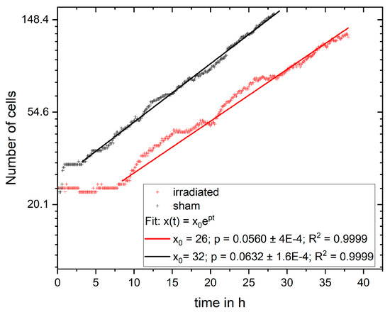 with x(t) being the number of cells at time t, x0 the initial cell number, and p the growth rate. The growth rate is determined by using the single logarithmic representation of the function with and a linear fit of the data as shown in Figure 6. The fit was performed for the exponential phase, which started at 3.25 h in the sham sample and 8.5 h in the irradiated sample. For the fit, x0 was the number of cells at the corresponding starting times. For the non-irradiated cells, the growth rate is, and for the irradiated sample . Using the growth rate, the number of divisions and the number of daughter cells per mother cell can be calculated.