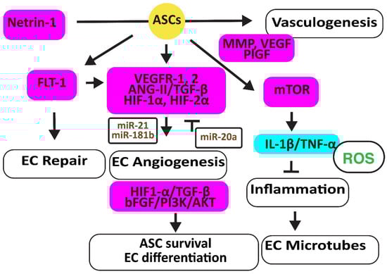 Exosomes from ACSs overexpressing glyoxalase-1 (GLO-1) protected ECs from high-glucose stress. They preserved the heart muscle structure and angiogenesis by inducing nitric oxide synthase (NOS), AKT, and MAPK (ERK) and inhibiting the Jun proto-oncogene expression, ROS release, and the activation of the inflammatory nucleotide-binding and oligomerization domain-like receptor family pyrin domain-containing 3 (NLRP3). They also inhibited caspase-1 and IL-1β pathways, protecting ECs and cardiomyocytes against cell death [34]. Netrin-1 overexpression increased the vasculogenic capacity of ASCs by inducing metalloproteinase (MMP)-2 and MMP-9, VEGF, and placental growth factor (PlGF) [35] (Figure 2).