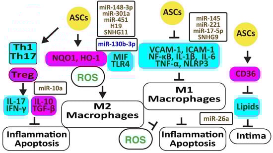 Autologous ASCs reduced inflammation by decreasing the release of vascular cell adhesion molecule (VCAM)-1, intercellular adhesion molecule (ICAM)-1, tumor necrosis factor-α (TNF-α), and nuclear factor-κB (NF-κB ) in a rat ischemia-reperfusion model [36]. In addition, ASCs inhibited atherosclerosis in a high-fat diet rabbit model by inhibiting the accumulation of oxidized LDL through increased CD36 protein, reverting M1 macrophage polarization, IL-6, and TNF-α release, and apoptosis [42]. Exosomes from ASCs enriched in stanniocalcin-1 (STC-1), a secreted glycoprotein that protects against inflammation, apoptosis, and necrosis, inhibited the production of NLRP3, caspase-1, and IL-1β in ECs, thereby improving angiogenesis [43]. MiR-145 and miR-221 were enriched in ASC exosomes and downregulated pro-inflammatory IL-6, NF-κB, and TNF-α while upregulating anti-inflammatory IL-10 [44]. Exosomal miR-17-5p blocked NLRP3 signaling in ASCs exposed to ANG-II [45]. MiR-26 might also inhibit inflammation by targeting TLR4 [46]. However, inflammatory TNF-α, IL-6, and IL-1β inhibited the expression of miR-26a in ASCs, reducing their capacity to correct blood lipids [47]. The long noncoding RNA-small nucleolar RNA host gene 9 (lncRNA-SNHG9) in exosomes from ASCs reverted the inflammation and apoptosis of ECs by targeting the TNF receptor type 1-associated death domain protein mRNA [48].