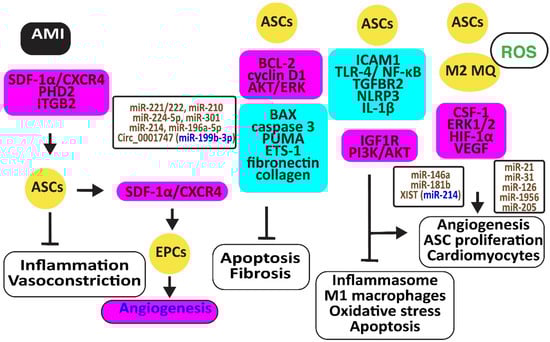 ASCs restored the expression of integrin β2 that specifically blocks ICAM-1 and reduces macrophage accumulation in infarcted myocardium, increasing cell viability, proliferation, and migration [67]. In addition, ASC-derived exosomes mitigated MI-induced cardiac damage by promoting macrophage M2 polarization by restoring the expression of the sphingosine-1-phosphate receptor 1 (S1PR1) [68,69]. MiR-146a in ACS-derived exosomes inhibited hypoxia-induced TLR-4 and NF-κB and prevented inflammation-associated myocardial cell apoptosis and fibrosis [70]. MiR-181b also protected cardiomyocytes by suppressing inflammatory TLR4 and NF-κB, cell death signaling, and promoting IGF1R and PI3K/AKT signaling [71]. MiR-671 in ASC-derived exosomes targeted the transforming growth factor beta receptor 2 (TGFBR2) and suppressed the phosphorylation of SMAD2, enhancing cardiomyocyte viability and reducing myocardial fibrosis and inflammation [72]. X-inactive specific transcript (XIST) in exosomes from ASCs protected mice against myocardial pyroptosis and arterial fibrillation by reducing the activation of the NLRP3 inflammasome and the secretion of IL-1β and IL-18 in cardiomyocytes by targeting miR-214-3p [73].