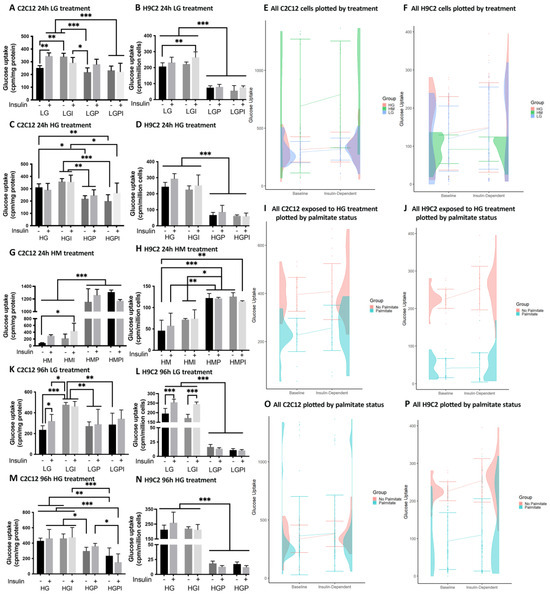 Basal- and insulin-dependent 3H-2-deoxy-glucose-uptake of C2C12 and H9C2 myotubes after 24 h and 96 h treatments. The effect upon an acute insulin stimulus (100 nM) was compared between different T2D-mimicking conditions and physiological (LG) and osmotic (HM) controls. IR occurred in all T2D-mimicking conditions. (E,F,I,J,O,P) Half-violin plots for combined 24 h and 96 h baseline and insulin-dependent glucose uptake, with error bars for standard error and lines connecting mean glucose uptake between conditions, by group. (A) C2C12 LG control groups after 24 h treatment. (B) H9C2 LG control groups after 24 h treatment. (C) C2C12 treated with high glucose, palmitate, and insulin for 24 h. (D) H9C2 treated with HG, palmitate, and insulin for 24 h. (E) All C2C12 cells plotted by treatment. (F) All H9C2 cells plotted by treatment. (G) C2C12 osmotic control groups treated with HM for 24 h. (H) H9C2 osmotic control groups treated with HM for 24 h. (I) C2C12 cells receiving high glucose treatment plotted by palmitate status. (J) H9C2 cells receiving high glucose treatment plotted by palmitate status. (K) C2C12 96 h LG treatment. (L) H9C2 96 h LG treatment. (M) C2C12 96 h HG treatments. (N): H9C2 96 h HG treatments. (O) All C2C12 cells plotted by palmitate status. (P) All H9C2 cells plotted by palmitate status. Insulin (+): 100 nM acute insulin; LG: low glucose 5 mM; LGI: low glucose + 1 nM insulin; LGP: low glucose + 150 µM palmitate for C2C12 and 75 µM palmitate for H9C2; LGPI: low glucose + 150 µM palmitate for C2C12 and 75 µM palmitate for H9C2 + 1 nM insulin; HG: high glucose 25 mM; HGI: high glucose + 1 nM insulin; HGP: high glucose + 150 µM palmitate for C2C12 and 75 µM palmitate for H9C2; HGPI: high glucose + 150 µM palmitate for C2C12 and 75 µM palmitate for H9C2 + 1 nM insulin; HM: 20 mM mannitol + 5 mM glucose; HMI: 20 mM mannitol + 5 mM glucose + 1 nM insulin; HMP: 20 mM mannitol + 5 mM glucose + 150 µM palmitate for C2C12 and 75 µM palmitate for H9C2; HMPI: 20 mM mannitol + 5 mM glucose + 150 µM palmitate for C2C12 and 75 µM palmitate for H9C2 + 1 nM insulin. Basal glucose uptake and insulin-dependent glucose uptake are presented as cpm per mg protein or per million cells. Values represent the means (SD); n = 6 per treatment group for LG and HG treatments, with n = 3 per group for HM treatments. One-way ANOVA for (A–D,G,H,K–N) p < 0.0001. Brackets indicate Tukey’s multiple comparisons tests with * p < 0.05, ** p < 0.01, *** p < 0.001.