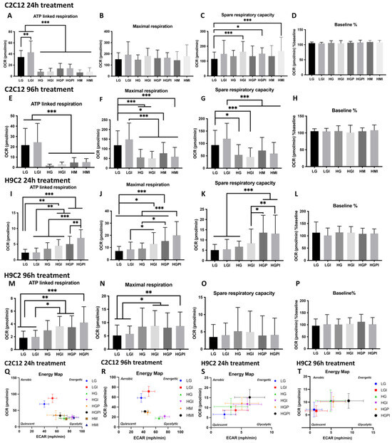 Plate-based oxygen consumption measurements of C2C12 (A–H,Q,R) and H9C2 (I–P,S,T) myotubes. The cells were plated at 1.2 × 104 cells per well in XF96 microplates and differentiated for 5 days. Treatments were carried out for 24 h or 96 h prior to the assay. (A) ATP-linked respiration of C2C12 myotubes after 24 h treatments (row/treatment factor (Rf) F (7, 292) = 70.16, p < 0.0001; column factor (Cf) F (2, 292) = 9.807, p < 0.0001). (B) Maximal respiration of C2C12 myotubes after 24 h treatments (Rf F (7, 288) = 2.206, p = 0.0338; Cf F (2, 288) = 9.502, p = 0.0001). (C) Spare respiratory capacity of C2C12 Myotubes after 24 h treatments (Rf F (7, 292) = 3.153, p = 0.0031; Cf F (2, 292) = 15.72, p < 0.0001). (D,H,L,P) Relative oxygen consumption rate percentage (D) Rf F (7, 282) = 1.516; Cf F (2, 282) = 5.305, (H) Rf F (5, 168) = 0.7035, Cf F (2, 168) = 2.439, (L) Rf F (5, 146) = 0.6060, Cf F (2, 146) = 1.126, (P) Rf F (5, 131) = 0.8578, Cf F (2, 131) = 0.7791). (E) ATP-linked respiration 96 h (Rf F (5, 123) = 21.21, p < 0.0001; Cf F (2, 123) = 28.60, p < 0.0001). (F) Maximal respiration 96 h (Rf F (5, 155) = 19.18, p < 0.0001; Cf F (2, 155) = 38.29, p < 0.0001). (G) Spare respiratory capacity 96 h (Rf F (5, 154) = 12.12, p < 0.0001; Cf F (2, 154) = 33.39, p < 0.0001). (I) ATP-linked respiration of H9C2 myotubes after 24 h treatments (Rf F (5, 139) = 23.58, p < 0.0001; incubation factor F (2, 139) = 7.225, p = 0.0010). (J) Maximal respiration 24 h (Rf F (5, 144) = 20.55, p < 0.0001; Cf F (2, 144) = 69.85, p < 0.0001). (K) Spare respiratory capacity 24 h (Rf F (5, 135) = 15.03, p < 0.0001; Cf F (2, 135) = 47.87, p < 0.0001). (M) ATP-linked respiration 96 h (Rf F (5, 178) = 8.173, p < 0.0001; Cf F (2, 178) = 0.2515, p = 0.7779). (N) Maximal respiration 96 h (Rf F (5, 185) = 5.086, p = 0.0002; Cf F (2, 185) = 47.23, p < 0.0001). (O) Spare respiratory capacity 96 h (Rf F (5, 186) = 0.6408, p = 0.6688; Cf F (2, 186) = 26.49, p < 0.0001). (Q,R) OCR plotted versus ECAR of C2C12 after 24 h (Q) and 96 h (R) treatment. (S,T) OCR plotted versus ECAR of H9C2 after 24 h (S) and 96 h (T) treatment. LG: low glucose 5 mM; LGI: low glucose + 1 nM insulin; HG: high glucose 25 mM; HGI: high glucose + 1 nM insulin; HGP: high glucose + 150 µM palmitate for C2C12 and 75 µM palmitate for H9C2; HGPI: high glucose + 150 µM palmitate for C2C12 and 75 µM palmitate for H9C2 + 1 nM insulin; HM: 20 mM mannitol + 5 mM glucose; HMI: 20 mM mannitol + 5 mM glucose + 1 nM insulin. Each graph represents data of minimum of three independent biological replicates presented as means ± standard deviation; n per treatment group = 8–15 (C2C12) or 6–15 (H9C2) wells per assay. Two-way-ANOVA for row factor treatment (Rf) and column factor Seahorse assays (Cf). Significance of secondary pairwise comparisons among treatments by Tukey´s test is indicated by brackets and asterisks *: p < 0.05; **: p < 0.01; ***: p < 0.001 in the panels.
