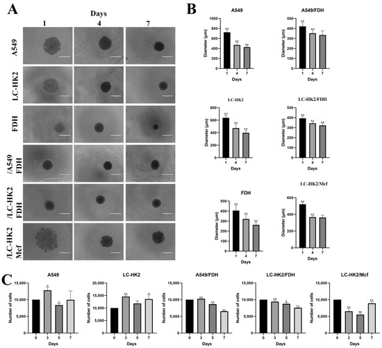 The LC-HK2 homotypic spheroids also decreased in size; after 7 days the diameter was ~400 µm, and the first day it was ~600 µm (more details in the figure). The LC-HK2/FDH heterotypic spheroids started with a smaller diameter than the homotypic, and after 7 days the diameter achieved ~320 µm, but they seemed to have a less variable diameter than the A549/FDH spheroids. The heterotypic LC-HK2/Mcf spheroids also showed a decrease in diameter, and after 7 days the diameter was ~360 µm (Figure 1B).