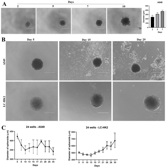 On the other hand, the LC-HK2 spheroids did not present a heightened darkened center, and, unlike the A549 spheroids, the LC-HK2 cells remained cohesive in the spheroids; after approximately 30 days in cell culture, the spheroids appeared larger (Figure 2C). Thus, when measuring the diameter of the A549 spheroids, the variation observed seemed to be the consequence of the greater number of detached cells from the spheroids. The diameter of the LC-HK2 spheroids increased over the days, achieving ~670 µm on the last day analyzed (Figure 2C).