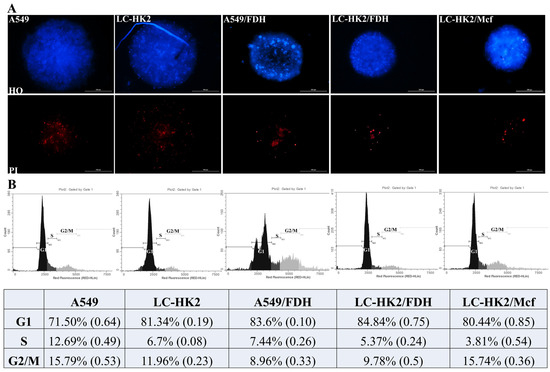 The S phase cell population was smaller for homotypic and heterotypic spheroids, with the homotypic spheroids A549 maintaining the highest percentage, at 12.69%, and the heterotypic spheroids LC-HK2/Mcf presenting the lowest percentage, at 3.81%. On the other hand, the cell population of the G2/M phase presented different percentages in the spheroid cells; the homotypic A549 spheroids presented 15.79%, and the LC-HK2 in turn obtained 11.96%. Heterotypic spheroids with FDH showed lower percentages, with 8.96% in A549/FDH and 9.78% in LC-HK2/FDH. The heterotypic spheroids LC-HK2/Mcf presented 15.74% of their population in the G2/M phase.