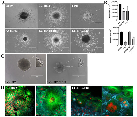 The spheroids were placed on an adherent surface for the cell migration. It was observed that the LC-HK2, A549, LC-HK2/FDH, A549/FDH, and LC-HK2/Mcf spheroids adhered in the first 24 h, but the FDH spheroids took much longer to adhere to the surface. After 72 h (Figure 9A,B), the measurement of the area occupied by migrating cells from the spheroids was performed. It was observed that the A549/FDH heterotypic spheroid area of migration was less than the area of A549 cells of homotypic spheroids, but that this area was similar to the area occupied by the cells of FDH spheroid.