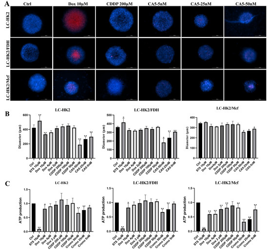 To analyze the responses of spheroids to different chemotherapy compounds and chemotherapy potentials, treatment of LC-HK2 and macrophages or fibroblasts heterotypic spheroids was performed. For this, doxorubicin (Dox), cisplatin (CDDP), chromomycin A5 (CA5) and Staurosporine (STS) were added to spheroid cultures for 48 h of treatment. The viability assays were carried out by staining with Hoechst and IP, measuring the diameter of the spheroids, and finally measuring the production of ATP.