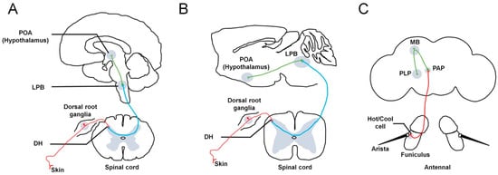 Neuronal pathways involved in thermosensation in different species. In humans (A) and rodents (B), temperature information from the skin is sensed by primary somatosensory neurons, whose cell bodies are located in the dorsal root ganglia. Subsequently, these neurons relay this information to the DH of the spinal cord (red lines). The DH contains neurons projecting to the LPB in the brainstem (blue lines). Finally, third-order neurons located within the LPB project to the POA of the hypothalamus (green line). Both warm- and cold-activated LPB neurons send projections to the POA of the hypothalamus. (C) In flies, the external sensors, called hot or cool cells, are located at the base of the aristae and in the sacculus region of the third antennal segment. All cool and hot cells project to a central region called the PAP to form synapses and connect with downstream PNs to convey temperature information (red line). The thermal PNs (green line) further transfer the received information to higher brain centers, including the MB and PLP. DH: dorsal horn. LPB: lateral parabrachial nucleus. POA: preoptic area. TRPP: transient receptor potential polycystin. PAP: proximal antennal protocerebrum. MB: mushroom body. PLP: posterior lateral protocerebrum. PNs: projection neurons.