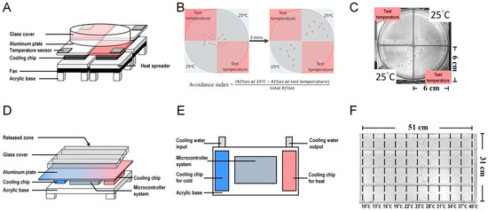 Thermoelectric devices used for temperature-related behavioral analysis in Drosophila. (A) The two-choice thermoelectric device consists of a microcontroller system, temperature sensors, aluminum plates, cooling chips, heat spreaders, and a glass cover. Pulse-width modulation (PWM) is used to control the operating voltage of the thermoelectric cooling module, which controls the temperature of the aluminum plate ranging from 15 to 35 °C. A 6 cm × 6 cm aluminum sheet is placed on each thermoelectric cooling module to increase conduction velocity. For heat dissipation, a heat spreader with an aluminum plate and a fan is placed below each cooling chip. Four thermoelectric cooling modules are arranged to form an arena, and a temperature sensor is added to each thermoelectric cooling module. (B,C) Diagram illustrating the two-choice assay behavior. Three minutes after the flies are placed in the arena, they seek a comfortable temperature environment through temperature avoidance. Flies determine their Tp by comparing a series of experimental temperatures with a reference temperature (25 °C) [65]. (D) The temperature gradient device contains an aluminum plate, which is equipped with an array of thermoelectric chips at one side for the cold source and another array of thermoelectric chips at the other side for the hot source. An electro-couple thermometer and multiple temperature sensors are set within the aluminum plate to detect and monitor the plate temperature via a microcontroller system. Water (20 °C) flows around the thermoelectric cooling chips, which supply the cold source to dissipate the accumulated heat produced by the chips. (E) Top view of the temperature gradient device below the aluminum plate. (F) Drosophila temperature preference behavior assay. The aluminum plate is divided into 10 sectors, each with a temperature gradient ranging from 10 to 40 °C. Thirty minutes after the flies enter the chamber, they settle at their preferred temperature locations. Flies avoid extreme temperatures and determine their Tp through a balance between cold- and warm-avoidance behaviors [66].