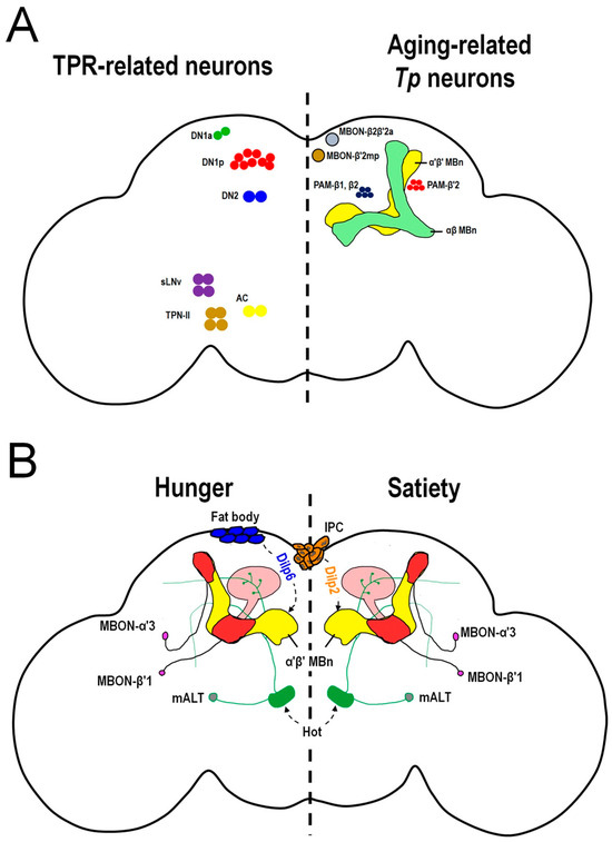 Chiang et al. recently demonstrated the relationship between satiety/hunger and temperature signals within MB-based neuronal circuits [65] (Figure 3B). The authors found that the feeding state significantly affects hot-avoidance behavior (HAB) in Drosophila. Behavioral assays revealed that hungry flies exhibit a strong HAB but not cold-avoidance behavior compared to sated flies. The authors also showed that MBn activity is critical for HAB, and α′β′ MBn is required for HAB in both sated and hungry states, while αβ and γ MBn are required for HAB only during the sated state [65]. Furthermore, the authors showed that Dilp2 is secreted from IPCs, which induces the PI3K/AKT signaling in α′β′ MBn that strongly suppresses the heat response in sated flies. Conversely, during the hungry state, Dilp2 secretion from IPCs is significantly reduced. Instead, Dilp6 is released from the fat body, which triggers the Ras/ERK signaling pathway in α′β′ MBn that shows a weak suppression of heat response in the hungry state. These results indicate that distinct insulin modulations regulate Drosophila HAB under different feeding conditions. Moreover, the modulated hot signals within the α′β′ MBn are further transmitted through MBON-α′3 and MBON-β′1 to execute proper HAB in both feeding states. These behavioral changes in HAB are crucial for the survival of flies. One hypothesis is that, under starvation conditions, flies conserve energy by decreasing their body temperature to reduce the rate of metabolism and become more sensitive to hot stimuli. Therefore, HAB should be increased to avoid hot environments in the hungry state. In contrast, flies become less sensitive to heat and exhibit reduced HAB, which allows them to approach higher temperatures, thereby increasing their metabolic rates after feeding [95,96].
