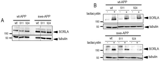 Because SorLA is involved in APP trafficking [50] and because APP routing is affected by the Swedish mutations, we first carried our study on cells expressing either wt- or swe-APP. In order to bring insights on expressions and fate of SorLA mutants, we assessed the influence of the proteasome inhibitor lactacystin [51]. This pharmacological treatment was previously shown to affect APP or secretases-related proteins [29]. We observed a potentiation of SorLA511 and SorLA924 upon proteasome inhibition in both wt- and swe-APP-expressing cells.
