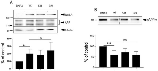 Influence of wild-type and mutated SorLA on endogenous wt-APP expression and secreted sAPPα. Empty pcDNA3 (DNA3), wild-type (SorLAwt), SorLA511 or SorLA924 cDNA were transiently transfected in wt-APP-expressing HEK293 cells (A). Twenty-four hours after transfection, secretates were recovered then cells were harvested and sAPPα and APP expressions were monitored by Western blot as described in experimental procedures. Bars are densitometric analyses expressed as percent of control (DNA3)-transfected cells taken as 100 and are the means ± SEM of 3 (A) or 4 (B) independent determinations. **, p < 0.01; ***, p < 0.001; ns, non-statistically significant. All full gels are shown in Supplementary Materials.