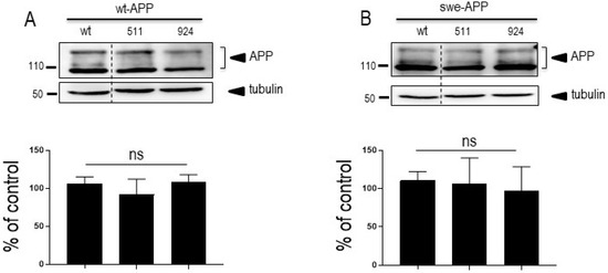 Influence of wild-type and mutated SorLA on wt-APP and swe-APP expressions. cDNA encoding wild-type (SorLAwt), SorLA511 or SorLA924 cDNA were transiently transfected in wt-APP- (A) or swe-APP- (B) expressing HEK293 cells. Twenty-four hours after transfection, cells were harvested then APP expression was monitored by Western blot as described in experimental procedures. Bars are densitometric analyses expressed as percent of control (SorLAwt cDNA transfection in corresponding cells) and are the means ± SEM of 3 (A) or 4 (B) independent determinations. ns, non-statistically significant. All full gels are shown in Supplementary Materials.
