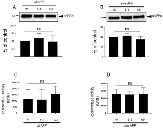 APP undergoes both constitutive and regulated non amyloidogenic processing by α-secretase, which leads to sAPPα secretion and concomitant formation of its C-terminal counterpart C83. We show that endogenous secreted sAPPα was reduced in cells overexpressing wt-SorLA (Figure 2B). As expected, wt-APP expression increases sAPPα in stably transfected cells (compare mock and DNA3 lanes in Supplementary Figure S3B). Of note, the recovery of endogenous sAPPα (Figure 2B) or sAPPα in both stably (compare DNA3 and mutant lanes in Supplementary Figure S3B) and transiently (Figure 4A) transfected cells expressing APP were similarly reduced by wt and mutated SorLA. SorLA mutations also did not affect sAPPα recovery in swe-APP-expressing cells (Figure 4B). This set of data indicating a lack of influence of SorLA mutations on the non-amyloidogenic pathway of APP was further confirmed by direct fluorimetric measurement of α-secretase activity by recording the phenanthroline–sensitive JMV2770-hydrolyzing activity [22] on intact wt-and swe-APP cells. Thus, no difference in α-secretase activity in wt- and swe-APP plated cells was observed (Figure 4C,D).