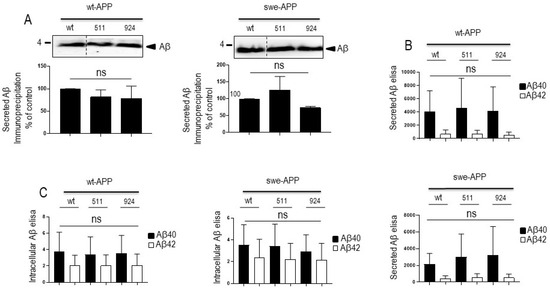 We aimed at examining the influence of SorLA on Aβ production/recovery in our transient and stably transfected cells. We first measured total Aβ peptides recovery in secretates of wt-APP-expressing cells by immunoprecipitation (Supplementary Figure S4A) in the presence of the inhibitor phosphoramidon in order to prevent neprilysin-dependent degradation of Aβ peptides [24,30,31,32]. As previously reported, wt-SorLA reduces total Aβ, the recovery of which was similarly triggered by SorLA511 and SorLA141 (Supplementary Figure S4A). It is well known that Aβ is mainly a mix of Aβ40 and Aβ42, in which the latter accounts for about 10% of total Aβ and that slight modifications of Aβ42/40 ratio could drive toxic phenotypes in cells [33]. Since the tiny modulation of Aβ42 could have been underscored in the total Aβ immunoprecipitation procedure, we have delineated the respective levels of Aβ40 and Aβ42 by sensitive ELISA. As previously described, Aβ42 levels correspond to about 10–15% of Aβ40 (compare values in DNA condition in Supplementary Figure S4B,C). However, we did not observe SorLA-related modifications of Aβ40 and Aβ42 recoveries, except for the 924 SorLA mutant that triggers a faint increase of secreted Aβ42 (Supplementary Figure S4C) but not Aβ40 (Supplementary Figure S4B). Overall, the above data were confirmed in wt-APP-expressing transient transfectants. Thus, neither total Aβ (Figure 5A) nor Aβ40 and Aβ42 (Figure 5B) measured in secretates by ELISA were affected by SorLA mutations in APP expressing cells (Figure 5A,B). Total secreted Aβ was also not affected by SorLA mutants in swe-APP-expressing cells (Figure 5A).
