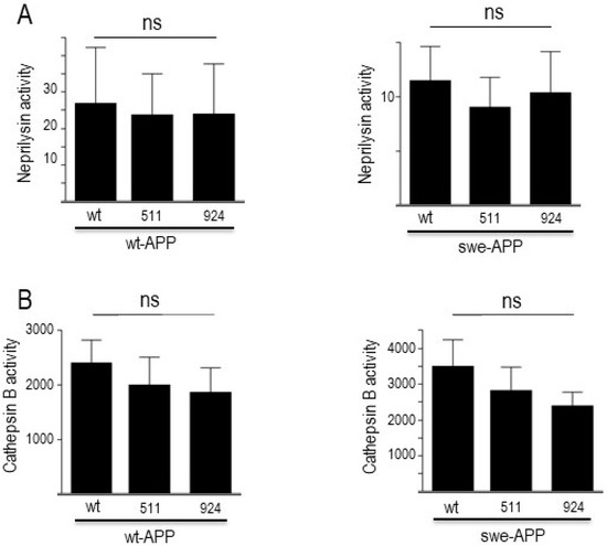 Influence of wild-type and mutated SorLA on neprilysin and cathepsin B activities. cDNA encoding wild-type (SorLAwt), SorLA511 or SorLA924 cDNA were transiently transfected in wt-APP- or swe-APP-expressing HEK293 cells. Twenty-four hours after transfection, neprilysin (A) and cathepsin B (B) activities were fluorimetrically measured with either Suc-Ala-Ala-Phe-7AMC (in the absence or presence of the NEP inhibitor phosphoramidon) or with carboxybenzoyl-Arg-Arg-7-Amido-4-methylcoumarin (without or with leupeptin) for neprilysin and cathepsin B, respectively. Bars correspond to the inhibitor-sensitive hydrolyzing activities and are the means ± SEM of 5 independent experiments. ns, non-statistically significant.