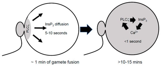 There is substantial evidence that the Ca2+ oscillations at fertilization are initiated by an isoform of phospholipase C (PLC) called PLCzeta (PLCz1 or PLCζ). PLCζ is a sperm-specific protein that has been shown to cause Ca2+ oscillations and egg activation in mouse, human, pig, and cow eggs [,,]. PLCζ is found in cytosolic sperm extracts that can cause Ca2+ oscillations in eggs after microinjection []. The presence of PLCζ in the sperm head can also explain why the direct injection of sperm into eggs, so-called intracytoplasmic sperm injection (ICSI), also triggers a series of prolonged Ca2+ oscillations [,]. PLCζ is present in sperm at a concentration that can cause Ca2+ oscillations in eggs, and it is localized inside the sperm in the post-acrosomal region, which is where sperm–egg fusion first occurs []. It is thought that the PLCζ protein diffuses into the egg in the first few minutes after sperm–egg membrane fusion.