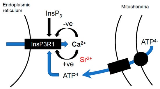 A schematic diagram of the way ATP4− may regulate the IP3R1 in eggs. The IP3R1 in the ER membrane can respond to Ca2+ at two sites, one inhibitory and one stimulatory. InsP3 binding inhibits the inhibitory site (−ve) to stimulate Ca2+ release [,]. ATP4− increases the Ca2+ sensitivity of the stimulatory site (+ve) to promote Ca2+ release []. Sr2+ appears to promote IP3R1 opening by binding predominantly to the stimulatory site [,]. Mitochondria export ATP into the cytosol in the form of ATP4−, which will rapidly form a complex with Mg2+, but ATP4− may be more concentrated in regions close to the mitochondrial outer membrane.