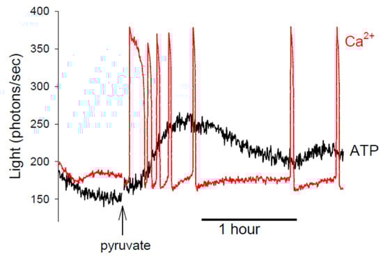 A recording of Ca2+ and ATP changes in mouse eggs incubated in a medium containing 5 mM Sr2+, as described and presented previously in Storey et al. []. The Ca2+ changes are measured with a fluorescent dye and shown in red; the ATP changes are monitored using the luminescence of luciferase and shown in black. In the initial part of the recording, the eggs are in a medium that lacks any metabolites; it has low ATP, and no Ca2+ oscillations are seen. After ~40 min, pyruvate (1 mM) is added to the medium containing the eggs. This leads to an increase in ATP and the triggering of Ca2+ oscillations.