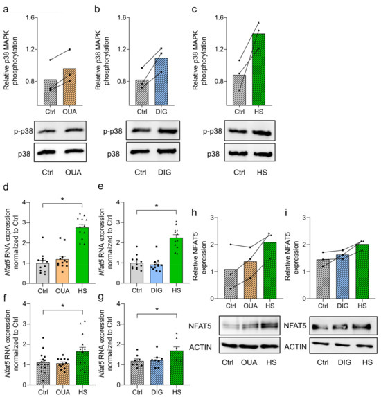 3.4. Cardiac Glycosides Induce p-p38/MAPK Signaling, Whereas NFAT5 Expression Remains Unchanged