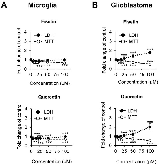 Figure 1. Dose-dependent lactate dehydrogenase (LDH) release and mitochondrial metabolic activity (MTT) in response to fisetin and quercetin. (A) Human microglia and (B) GBM cells were treated with increasing concentrations of selected compounds (0, 5, 15, 25, 50, 100 μM for fisetin and quercetin) for 24 h in serum-deprived conditions. Culture medium was used to assess LDH release, and cellular mitochondrial metabolic activity was measured using the MTT assay. Shown are the average fold change in LDH or MTT compared to the mean of the untreated control (set to 1) ±SD from at least 3 independent experiments. (*** p < 0.001).