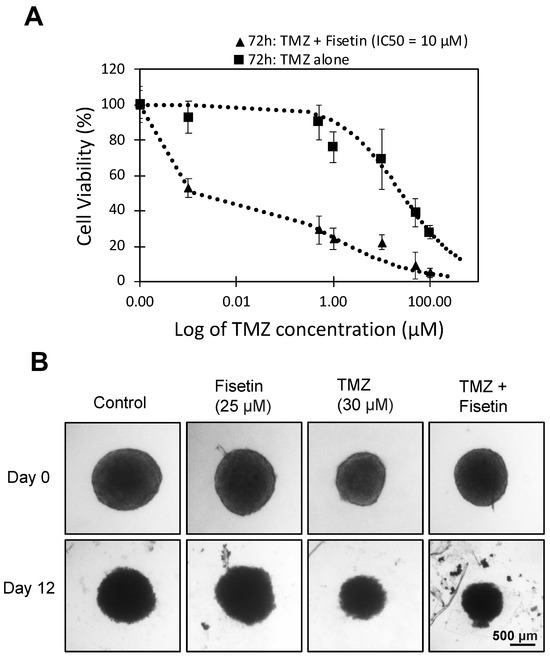 Figure 2. Dose-dependent effect in response to fisetin and TMZ. (A) Dose-dependent decrease in cell viability (72 h) with the combination of a fixed concentration of fisetin (10 μM) and increasing concentration of TMZ (0.001, 0.5, 1, 10, 50, and 100 μM). Each point represents the mean from three independent experiments normalized to the untreated control. Cell viability was measured by counting Hoechst 33342-labeled nuclei imaged using a fluorescence microscope. (B) Representative micrographs of GBM tumoroids treated with TMZ (30 μM) +/− fisetin (25 μM) on day 0 and day 12. Tumor size (area) was calculated using ImageJ.