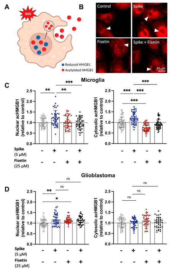 Figure 5. acHMGB1 in human GBM cells and microglia treated with fisetin +/− spike. GBM cells and microglia were treated with spike (5 μM), fisetin (25 μM), or a combination of spike and fisetin for 24 h in serum-free media. (A) Under stress, acHMGB1 translocates to the cytoplasm and can be released into the extracellular space as an alarmin. (B) Microglia were labeled for acHMGB1 (red) and imaged using a fluorescence microscope. Scale bar = 20 μm. The arrowheads represent cytosolic acHMGB1. Shown are the normalized intracellular fluorescence values to the mean of the untreated control (set to 1) in (C) human microglia and (D) GBM cells. Dotted lines represent the mean of the control group normalized to 1. Statistical analysis was assessed using two-way ANOVA, followed by Tukey’s multiple comparison test. At least 40 cells from three independent experiments were analyzed. Mean ± SD. (ns—nonsignificant, * p ≤ 0.05, ** p ≤ 0.01, *** p ≤ 0.001).