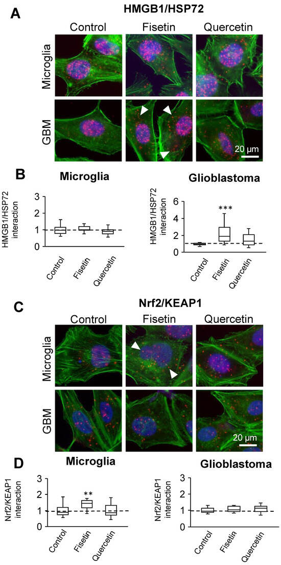 Figure 6. Nrf2-KEAP1 and HMGB1/HSP72 protein–protein interactions detected using proximity ligation assays. Interactions between (A,B) Nrf2-KEAP1 and (C,D) HMGB1/HSP72 in microglia and glioblastoma treated with fisetin (25 μM) or quercetin (25 μM) for 24 h in serum-deprived media. Shown are representative fluorescence micrographs with protein interactions (red dots) in cells labeled for actin (green) and nuclei (blue). The arrowheads indicate protein–protein interactions. Shown are the distribution of the number of interactions per cell as fold change in the untreated control (set to 1), with the minimum value, 25th to 75th percentiles, and maximum values indicated. Box blots show the median, 25–75% quartiles, minimum and maximum values. Dotted line represents the mean of the control normalized to 1. At least 60 cells from three independent experiments were analyzed. (** p < 0.01; *** p < 0.001).
