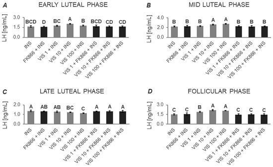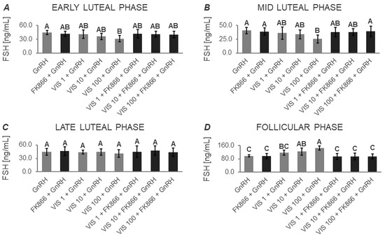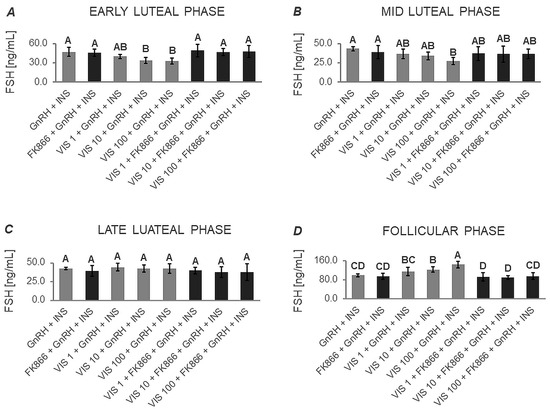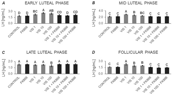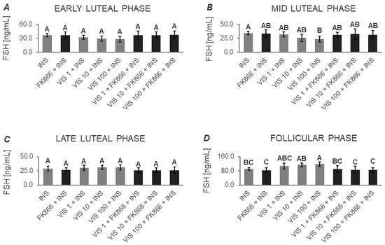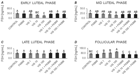 The two-way ANOVA followed by Duncan’s post hoc test (Supplementary Table S4, Figure 5, Figure 6, Figure 7 and Figure 8) demonstrated that the basal secretion of FSH was enhanced by VIS at the highest dose during the follicular phase (Figure 5D). Contrarily, VIS at doses of 10 and 100 ng/mL decreased the basal secretion of FSH during the early luteal phase (Figure 5A). Similarly, VIS at the highest dose suppressed the basal secretion of FSH during the mid-luteal phase (Figure 5B).
