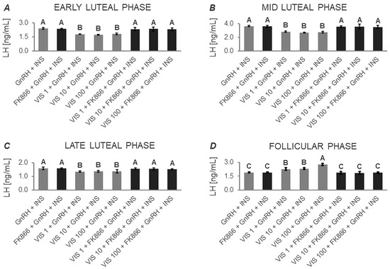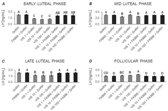 VIS, at all studied doses, enhanced GnRH + INS-stimulated LH secretion during the follicular phase (Figure 4D). On the other hand, administration of VIS at all studied doses decreased GnRH + INS-stimulated LH secretion during the early, mid-, and late luteal phases (Figure 4A, Figure 4B, and Figure 4C, respectively).