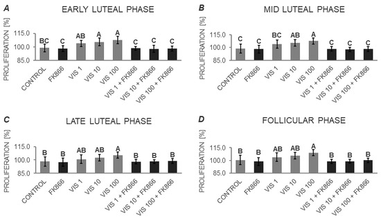 Multifactorial ANOVA (Supplementary Table S5) showed that the proliferation of cells was influenced by the phase of the estrus cycle, the dose of VIS (values for the phase and vis dose, respectively), and the interaction of factors phase*vis dose. Further, based on two-way ANOVA followed by Duncan’s post hoc test (Supplementary Table S6, Figure 9), the proliferation of APc was found to be stimulated by VIS at doses of 10 and 100 ng/mL during the early and mid-luteal phases (Figure 9A,B). In addition, cell proliferation was enhanced by the highest dose of VIS during the late luteal and follicular phases (Figure 9C and Figure 9D, respectively). Importantly, no changes in the proliferation of APc were observed in the presence of the VIS inhibitor—FK866. Co-application of VIS and FK866 suppressed the inhibitory effect of VIS to the control level (Figure 9).