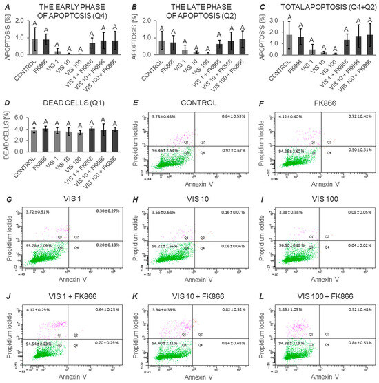 Performed statistical analysis (two-way ANOVA followed by a Duncan’s post hoc test; Supplementary Table S7 and Figure 10) revealed no significant effect of VIS or/and its inhibitor (FK866) on either the early or late phase of apoptosis of APc (Figure 10A and Figure 10B, respectively), or on the total percentage of apoptotic cells (Figure 10C). Additionally, no significant effect of VIS or/and its inhibitor (FK866) on the number of dead cells was observed (Figure 10D).