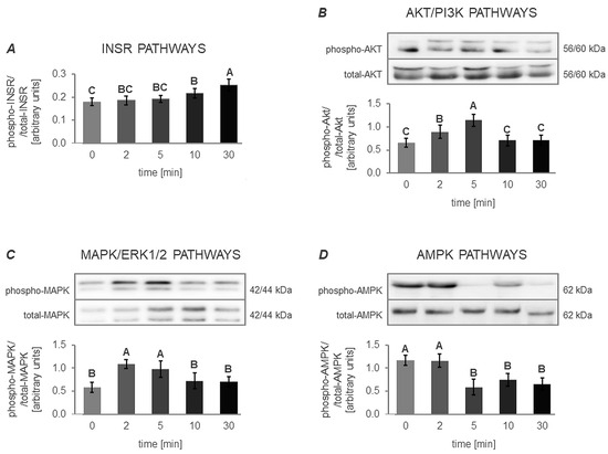 One-way ANOVA followed by a Duncan’s post hoc test indicated that VIS affects the activity of the INSR, AKT/PI3K, MAPK/ERK1/2, and AMPK signaling pathways (Figure 11).