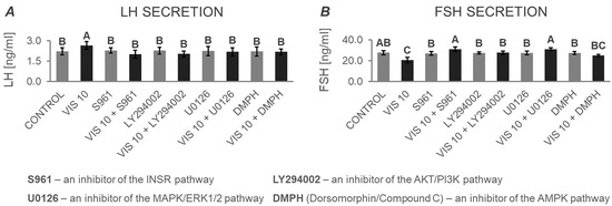 Based on multifactorial ANOVA followed by Dunnett’s post hoc test, the results obtained in Expt. No. 1 were confirmed—VIS was found to increase basal LH secretion (Figure 12A) and decrease basal FSH secretion (Figure 12B). Furthermore, post hoc testing revealed that the effect of VIS was blocked in the presence of inhibitors of INSR, AKT/PI3K, MAPK/ERK1/2, and AMPK pathways (Figure 12A and Figure 12B, respectively). These findings indicate that VIS may act in porcine APc through all the studied pathways.