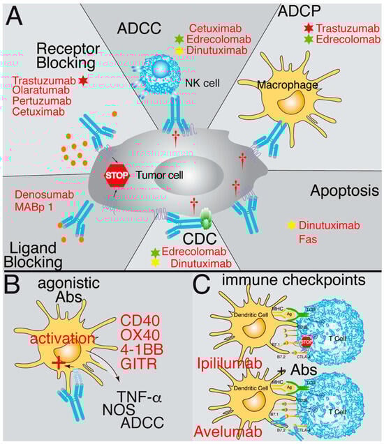 Schematic representation illustrating the mechanisms of action of therapeutic antibodies. (A) Some antibodies block the interaction between ligands and receptors by binding to either the ligand (ligand blocking) or the receptor (receptor blocking), preventing the signaling promoting tumor growth. Other antibodies bind to tumor antigens and then are recognized by natural killer cells (NK), triggering their cytotoxic activity, known as ADCC (antibody-dependent cell cytotoxicity). Another possibility is that when the antibody binds to the tumor antigen, it opsonizes the cell and activates phagocytic cells, thereby triggering antibody-dependent cell phagocytosis (ADCP). Additionally, the antibody can fix complement and trigger complement-dependent cytotoxicity (CDC) after binding to the tumor cell. Furthermore, some antibodies can trigger direct apoptosis after binding to an antigen on the tumor’s cell surface. (B) Other antibodies have agonistic effects. They identify antigens in the antigen-presenting cells and trigger an activating response of these cells similar to the ligand binding. (C) The last group corresponds to antibodies recognizing immune checkpoint antigens, such as CTLA-4, PD-1, or PD-L1. Here, the antibody acts by inhibiting the binding of the ligand and prevents the negative signaling through these receptors. Examples of antibodies functioning through these mechanisms are in red. Stars of different colors indicate antibodies that work through several mechanisms of action.