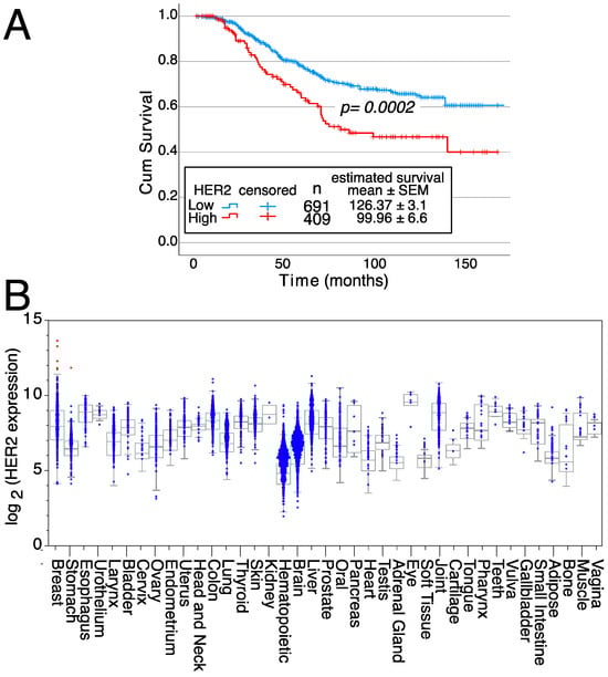 Effects of HER2 on survival and expression in normal tissues. (A) Kaplan–Meier survival curves depending on either high or low/intermediate HER2 expression levels, indicating the mean survival ± SEM as well as the statistical significance of the differences in survival curves determined using the Chi-square test. Data from all breast cancer tumor patients from Figure 2A, for which survival data were available, were analyzed. (B) HER2 expression levels in normal tissue samples. Samples expressing high levels of HER2 are in red, whereas samples expressing low/medium levels of HER2 are in blue. Medians, the first and third quartiles (boxes), and the 10th and 90th percentiles (whiskers) are shown for each normal tissue. The number of samples for each normal tissue (n) is shown in Supplemental Table S2. Expression data were obtained from the GENT2 public database [109].
