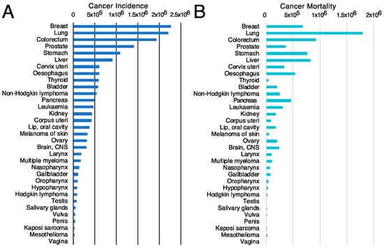 Cancer incidence and cancer mortality worldwide. (A) cancer incidence [117] and (B) cancer mortality [117] data obtained from GLOBOCAN2020 from the International Agency for Research on Cancer from the World Health Organization [118].