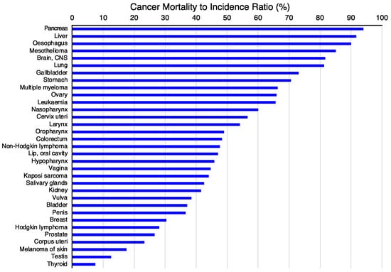 The first criterion will be to decide the tumor type on which to concentrate the efforts. For this purpose, the incidence (Figure 4A) and mortality (Figure 4B) rates for different tumor types [117] might be valuable since they classify the types of tumors based on the number of new cases or mortality, respectively. However, other parameters, such as the mortality-to-incidence ratio (Figure 5), might seem more appropriate since they allow the classification of the different tumors based on their life-threatening activity. It shows, for example, that two types of tumors with a similar incidence, like thyroid tumors (>5 × 105 new cases/year, 9th on the incidence list) and pancreatic cancer (~5 × 105 new cases/year, 12th on the incidence list), have contrasting outcomes. Whereas >90% of the patients with thyroid tumors survive, >90% of the patients diagnosed with pancreatic cancer die. These data are available from public databases. In the examples shown here, the data was obtained from the International Agency for Research on Cancer from the World Health Organization [118] but are also available from other sources, such as the American Cancer Society [119] or Cancer Research UK [120].