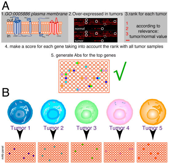 Future of personalized medicine using therapeutic antibodies. (A) The idea is to select a series of genes from the human genome, coding for plasma membrane proteins, which are over-expressed in tumors (≥2-fold higher expression levels). On each tumor sample, the tumor/normal expression ratio for each gene allows it to be ranked. Afterward, the scores for the different tumors are analyzed together to make a rank for the genes on that set of tumors. According to the biological features of these genes, the top-ranking ones are used to select mAbs. Then, they are tested for the ability to inhibit or delay tumor growth. This panel of antibodies (in this hypothetical example, represented by 96 different antibodies) will have therapeutic potential for one or more types of tumors. (B) The tumor samples for each patient (tumors 1–5) are screened for the expression of the antigens recognized by the antibodies, allowing to select a series of antibodies, positive for each particular tumor (4 to 6 in the hypothetical example, with some antibodies not recognizing any tumor samples and others recognizing one, two, or even three tumor samples). Thus, a combination containing 2–3 different antibodies could be used for the initial treatment of each patient, allowing the killing of the maximum number of tumor cells from the beginning of the treatment.