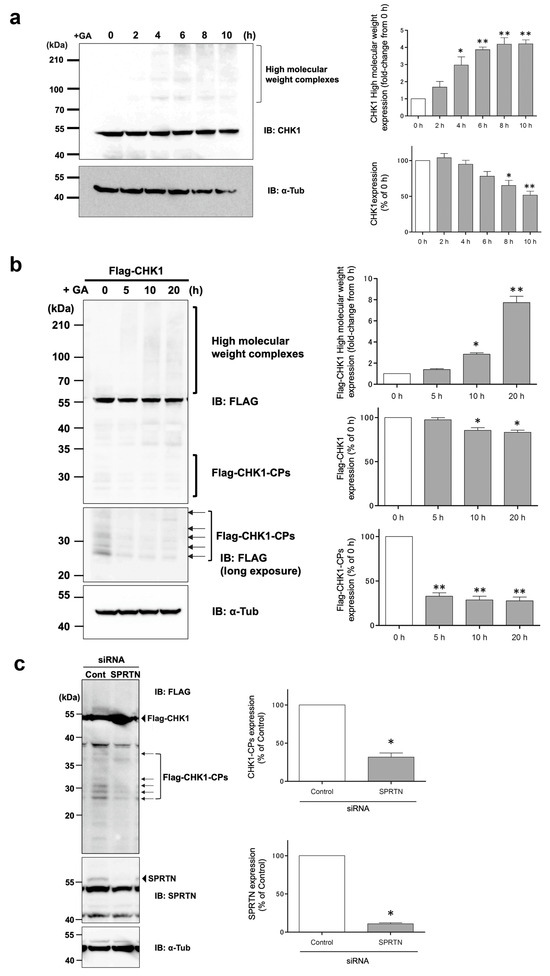 As Halder et al. previously reported [28], CHK1-CPs are formed through cleavage by SPRTN metalloprotease, and in our cell model, the knockdown of SPRTN by the transfection of a specific siRNA reduced the basal expression levels of Flag-CHK1-CPs (Figure 1c). While Flag-CHK1-CPs were easily detectable in basal state cells, the expression levels of endogenous CHK1-CPs were so low that only a few of their protein bands were detectable after prolonged exposure in our Western blot analysis. The pretreatment with the proteasome inhibitor MG132 increased multiple bands of CHK1-CPs to readily detectable levels (Figure 5a), suggesting that the ubiquitin–proteasome pathway is involved in regulating the basal expression levels of CHK1-CPs. The current findings, which reveal an increase in ubiquitin modification of d270KD upon GA stimulation (Figure 6b), emphasize the importance of identifying the ubiquitin ligase involved in this modification for a comprehensive understanding of the degradation mechanism of d270KD.