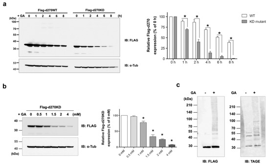 We then investigated the concentrations of GA that induced the rapid degradation of d270KD. The GA stimulation for 6 h resulted in significant degradation from a concentration of 1.5 mM (Figure 2b). These results indicate that d270KD was rapidly degraded upon intracellular GA-AGE modifications by a short-term GA stimulation. In contrast to d270WT, no GA-stimulated high-molecular-weight complex bands were observed in d270KD (Figure 2a), suggesting that an inactivating mutation in the wild-type form changed the structure to be less susceptible to glycation modifications by GA. We then performed GA-AGE conversion experiments on d270KD in vitro in the absence of a degradation system. Flag-d270KD was expressed in cells, and the recombinant protein was purified by immunoprecipitation with a FLAG antibody and then reacted with GA in a tube for 20 h. The results obtained showed that the GA stimulation resulted in the appearance of high-molecular-weight complexes, which were detected by anti-TAGE antibodies (Figure 2c). Therefore, the d270KD mutant was considered to be TAGE-modified by GA as well as d270WT; presumably, high-molecular-weight complexes were not detected in these cells because GA-stimulated degradation was accelerated.