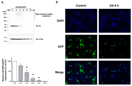 GA-stimulated rapid intracellular degradation of d270KD-EGFP fusion protein. (a) The expression vector of d270KD fused to EGFP (d270KD-EGFP) was transfected into COS-7 cells and stimulated with 4 mM GA 48 h later. Cell lysates were collected at the indicated times and subjected to a Western blot analysis. The densitometric quantification of d270KD-EGFP values relative to the non-treatment group (0 h) is shown. The data were analyzed using a one-way ANOVA followed by Dunnett’s post hoc test and are shown as the mean ± SEM of three independent experiments. * p < 0.001. (b) COS-7 cells were transfected with the d270KD-EGFP expression vector for 24 h, stimulated with phosphate buffer (control) or 4 mM GA for 6 h, and then fixed. Nuclei were counterstained with DAPI and analyzed by fluorescence microscopy. Scale bars = 50 µm.