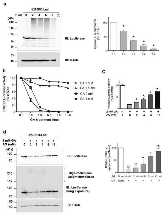 Rapid proteolysis of d270KD-fused luciferase and its reduced activity upon GA stimulation. (a) A d270KD fused to luciferase expression vector (d270KD-Luc) was transfected into HeLa cells and stimulated with 4 mM GA after 24 h. Cell lysates were collected at the indicated times and subjected to a Western blot analysis. The densitometric quantification of d270KD-Luc values relative to the non-treatment group (0 h) is shown. The data were analyzed using a one-way ANOVA followed by Dunnett’s post hoc test and are shown as the mean ± SEM of three independent experiments. * p < 0.001. (b) As in (a), d270KD-Luc was transfected into HeLa cells for 24 h and stimulated with GA at the indicated concentrations. Cell lysates collected at each indicated time were subjected to the luciferase assay. (c) HeLa cells were transfected with d270KD-Luc for 24 h and then pretreated with phosphate buffer or aminoguanidine (AG) at the indicated concentrations for 2 h. The cells were then stimulated with phosphate buffer or 2 mM GA for 6 h and lysed. Cell lysates were collected and luciferase activity was measured and expressed as 100 for the control. Each value was obtained from three independent experiments. Error bars indicate SEM. * p <0.01 versus 2 mM GA alone. (d) Cell lysates treated similarly to the experiment in (c) were subjected to a Western blot analysis using the antibodies indicated. The densitometric quantification of d270KD-Luc values relative to the non-treatment group (None) are shown. The data were analyzed using a one-way ANOVA followed by Dunnett’s post hoc test and are shown as the mean ± SEM of three independent experiments. * p < 0.01, ** p < 0.001, ns means not significant.