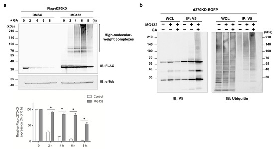Involvement of the proteasome pathway in the rapid degradation of d270KD by GA. (a) HeLa cells were transfected with the Flag-d270KD expression vector and cells were incubated 24 h later with 5 mM of a proteasome inhibitor (MG132) or DMSO (control) for 4 h. Cells were treated with 4 mM GA and cell lysates were collected at the indicated times for a Western blot analysis. The densitometric quantification of Flag-d270KD values relative to the non-treatment group (0 h) is shown. The data were analyzed using a two-way ANOVA followed by the Bonferroni post hoc test and are shown as the mean ± SEM of three independent experiments. * p < 0.001. (b) The GA stimulation increased the ubiquitination of d270KD-fused EGFP. The expression vector for the d270KD fused to EGFP (d270KD-EGFP) expression vector was transfected into HeLa cells for 48 h and the cells were then treated with DMSO (control) or 5 µM MG132 for 3 h. Cells were collected after the stimulation with phosphate buffer or 4 mM GA for 3 h. Cell lysates were extracted under denaturing conditions, diluted in lysis buffer, and immunoprecipitated (IP) with an anti-V5 antibody. Whole cell lysates (WCL) and IP samples were subjected to a Western blot analysis using the indicated antibodies.