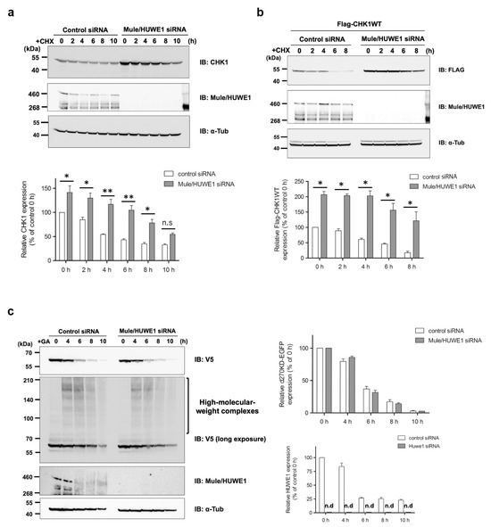 Effects of the elimination of Mule/HUWE1 E3 ubiquitin ligase on the rapid degradation of d270KD stimulated by GA (a) HeLa cells were transfected with scrambled control siRNA (control) or Mule/HUWE1 siRNA, treated with cycloheximide (CHX; 20 µg/mL) 48 h later, and cell lysates were collected at the indicated times. The resulting cell lysates were subjected to a Western blot analysis with the indicated antibodies. (b,c) Scrambled control siRNA or Mule/HUWE1 siRNA was transfected into HeLa cells as in (a), and cells were transfected 24 h later with a Flag-CHK1WT (b) or d270KD-EGFP expression vector (c). Cells were treated 24 h later with cycloheximide (CHX; 20 µg/mL) (b) or 2 mM GA (c) for the indicated times, and cell lysates were collected for a Western blot analysis. The densitometric quantification of endogenous CHK1 (a), Flag-CHK1WT (b), or d270KD-EGFP (c) values relative to the non-treatment group (0 h) is shown. The data were analyzed using a two-way ANOVA followed by the Bonferroni post hoc test and are shown as the mean values ± SEM of three independent experiments. * p < 0.01, ** p < 0.001, n.s and n.d mean not significant and not detected, respectively.