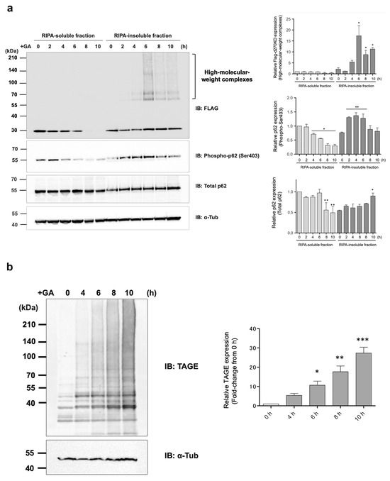 All high-molecular-weight complexes of d270KD formed by a GA stimulation accumulate in the insoluble fraction of RIPA. (a) A Flag-d270KD expression vector was transfected into HeLa cells, and cells were stimulated 24 h later with 2 mM GA and collected at the indicated times. Cells were lysed in RIPA buffer and separated into supernatant (RIPA-soluble fraction) and pellet (RIPA-insoluble fraction) by centrifugation. After the addition of SDS sample buffer to each fraction, samples from both fractions were analyzed by Western blotting using the antibodies indicated. The densitometric quantification of Flag-d270KD high-molecular-weight complex, p62 (phosphor-Ser403), and p62 (total) values relative to the non-treatment RIPA-soluble fraction group are shown. The data were analyzed using a two-way ANOVA followed by the Bonferroni post hoc test and are shown as the mean ± SEM of three independent experiments. * p < 0.05, ** p < 0.01 vs. 0 h. (b) HeLa cells were treated with phosphate buffer (control) or 2 mM GA. Cells were collected at the indicated times and lysed in RIPA buffer. Each cell lysate was separated into RIPA-soluble/-insoluble fractions in the same manner as in (a). Samples of RIPA-insoluble fractions were prepared by three independent experiments and subjected to a Western blot analysis using the indicated antibodies. The densitometric quantification of TAGE values relative to the non-treatment fraction group (0 h) is shown. The data were analyzed using a one-way ANOVA followed by Dunnett’s post hoc test and are shown as the mean ± SEM of three independent experiments. * p < 0.05, ** p < 0.01, *** p < 0.001.