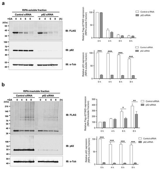 Effects of the p62/SQSTM1 knockdown on the rapid GA-stimulated degradation of d270KD. HeLa cells were transfected with scrambled control siRNA or p62/SQSTM1 siRNA and transfected 24 h later with a Flag-d270KD expression vector. Cells were stimulated 24 h later with 2 mM GA for the indicated times. RIPA buffer was added to cells and cell lysates were separated into RIPA-soluble (a) and RIPA-insoluble (b) fractions by centrifugation. Each fraction was analyzed by Western blotting using the indicated antibodies. The densitometric quantification of Flag-d270KD and p62 (total) values relative to the non-treatment group (0 h) is shown. The data were analyzed using a two-way ANOVA followed by the Bonferroni post hoc test and are shown as the mean ± SEM of three independent experiments. * p < 0.05, ** p < 0.01, *** p < 0.001.