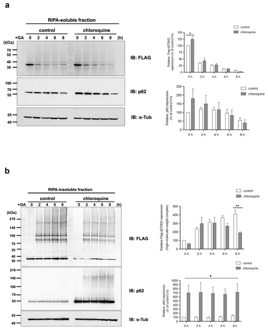 To examine the effect of chloroquine treatment on d270KD degradation in more detail, samples were separated into RIPA-soluble and RIPA-insoluble fractions for analysis. The results showed that in the RIPA-soluble fraction, a slight increase in the basal level of d270KD was observed upon chloroquine treatment in the untreated GA fraction (Figure 12a, 0 h). However, no effect of chloroquine was observed in GA-stimulated degradation of d270KD. On the other hand, an analysis of the RIPA-insoluble fraction showed a slight decrease in the high-molecular-weight complex level of d270KD by chloroquine treatment after 8 h of GA stimulation (Figure 12b). Interestingly, p62, which becomes high-molecular-weight upon GA stimulation, accumulated at higher levels in the RIPA-insoluble fraction upon chloroquine treatment. These results suggest that the autophagy pathway is partially involved in the regulation of the basal level of d270KD, but its inhibition has little effect on GA-stimulated degradation. It is conceivable that when autophagy is inhibited by chloroquine and yet stimulated by GA, p62 abnormally accumulates in the insoluble fraction, resulting in a slight decrease in the formation of the high-molecular-weight complexes of d270KD.