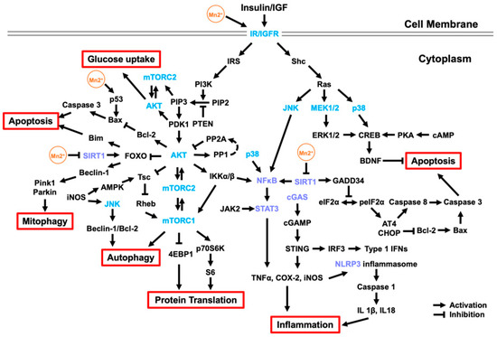 Due to the significant effects of Mn exposure on the nervous system, the mechanisms of Mn-induced neurotoxicity have been extensively studied, including neuroinflammation, protein homeostasis [30], mitochondrial function and REDOX homeostasis [31], calcium homeostasis [32], neurotransmitter metabolism [33], microRNA (miRNA) function [34], and metal homeostasis [35]. At present, the understanding of the underlying mechanisms of Mn neurotoxicity is rapidly developing. Several studies revealed the insulin-mimicking effects of Mn, which can activate several of the same metabolic kinases and directly increase peripheral and neuronal insulin and insulin-like growth factor (IGF)-1 levels in rodent models [36,37,38,39]. As an important cofactor of many kinases and phosphatases, Mn plays a key role in cell signaling pathways. Mn can activate mitogen-activated protein kinase (MAPK), protein kinase B (PKB/Akt), ataxia telangiectasia mutated (ATM), and mammalian target of rapamycin (mTOR) both in vivo and in vitro. Since these kinases regulate transcription factors, such as cyclic adenosine monophosphate (cAMP), cAMP response element-binding protein (CREB), p53, nuclear factor κB (NF-κB), and forkhead box O (FOXO), Mn can also regulate cellular function at the transcriptional level [40,41,42]. Therefore, it is important to study the role of Mn homeostasis and related signaling pathway in Mn essentiality and toxicity. However, it is not fully understood which Mn-dependent enzymes are most sensitive to changes in Mn homeostasis and the relationship between Mn and these signaling pathways. Therefore, this review focuses on cell signaling pathways associated with Mn neurotoxicity, including the classical insulin/IGF signaling pathway, neuroinflammatory pathways, and autophagy, which is an important downstream protein degradation pathway.